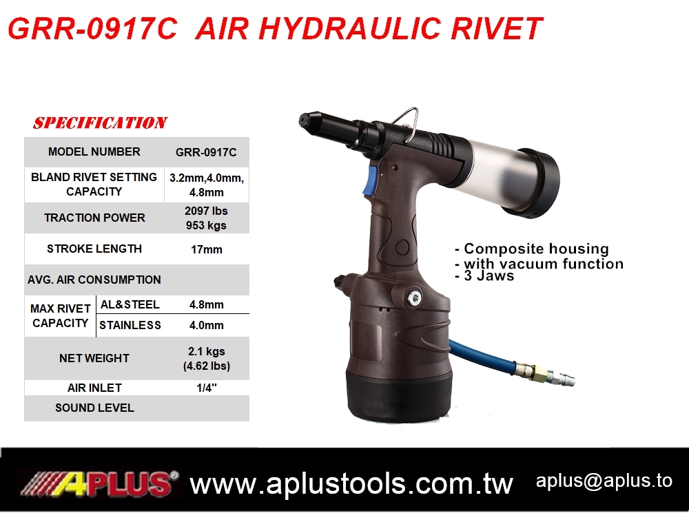 APLUS GRR-0917C air hydraulic riveter, Composite housing 4.8mm air riveter , 2097 lbs traction power, stroke length is 17mm,