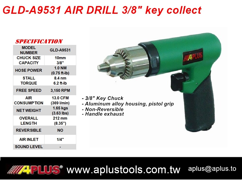 APLUS GLD-A9531, GEAR TYPE AIR DRILL, pistol grip, 3/8" chuck, aluminum housing, non-reversible, handle exhaust