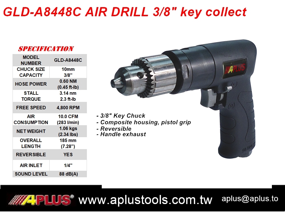 | Model | CHUCK SIZE | STALL TORQUE | Free Speed | Air consumption | Overall Length | Air Inlet | REVERSIBLE | SOUND LEVEL | Net Weight | ||||