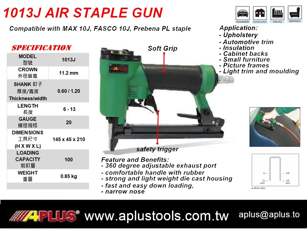 APLUS 1013J 空气钉枪。 钢制弹匣使用Max 10J订书钉,长度从6mm-13mm