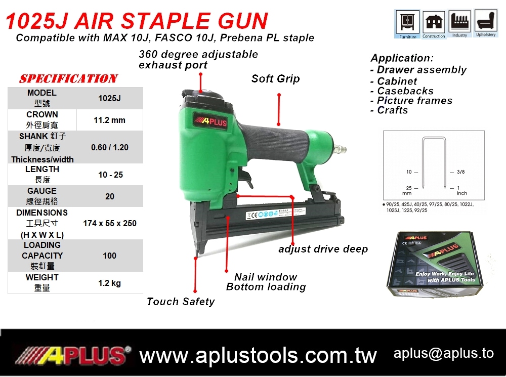 APLUS 1025J、18GA、12-25MM、11.2MM 皇冠气动订书机底部装载