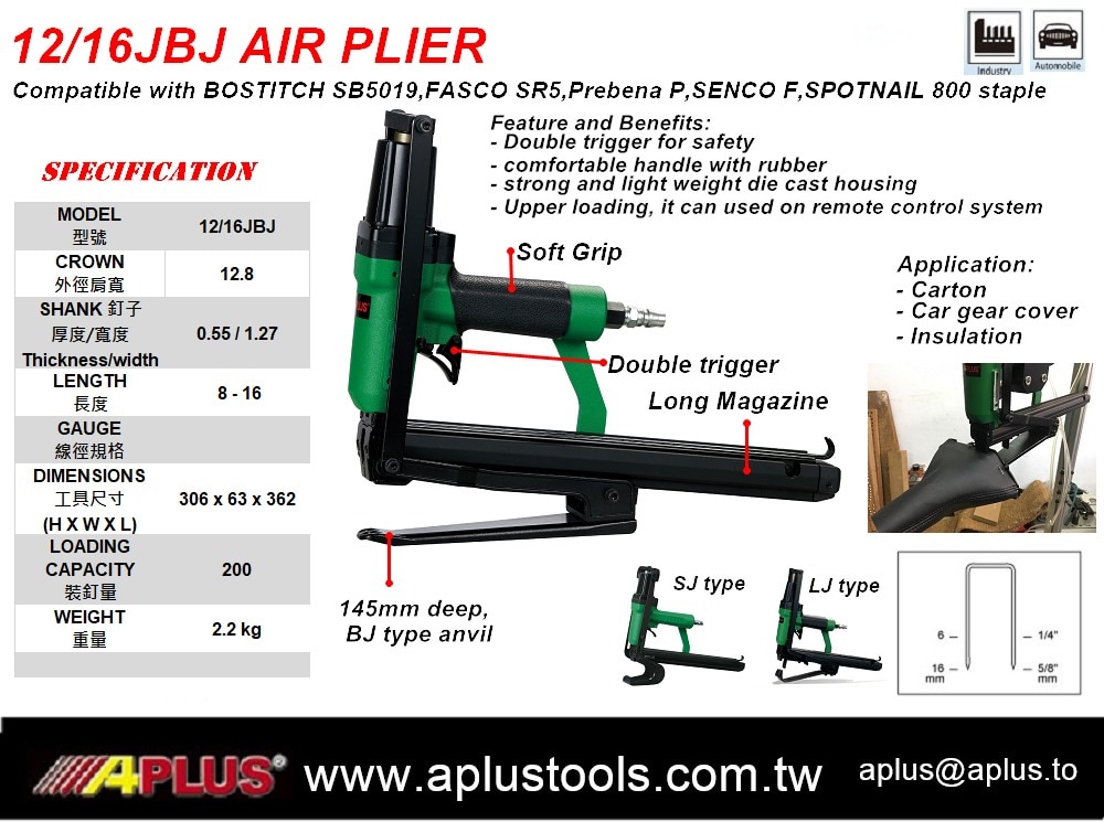 主页产品气动钳/纸板钳APLUS 12/16JBJ 天地蓋 封箱機 AIR PLIER 195 紙箱閉合釘 肩寬 12.8mm 線徑 0.55X1.27mm 用於瓦楞紙板蓋和托盤
