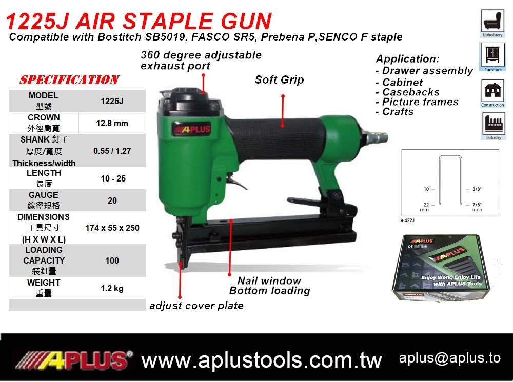 主页产品马钉枪中型馬釘槍APLUS 1225J 12-25 mm,肩寬12.8 mm,線徑 0.55x1.27mm SENCO F 型 氣動打釘機 下裝釘, 裝釘視窗 马钉枪