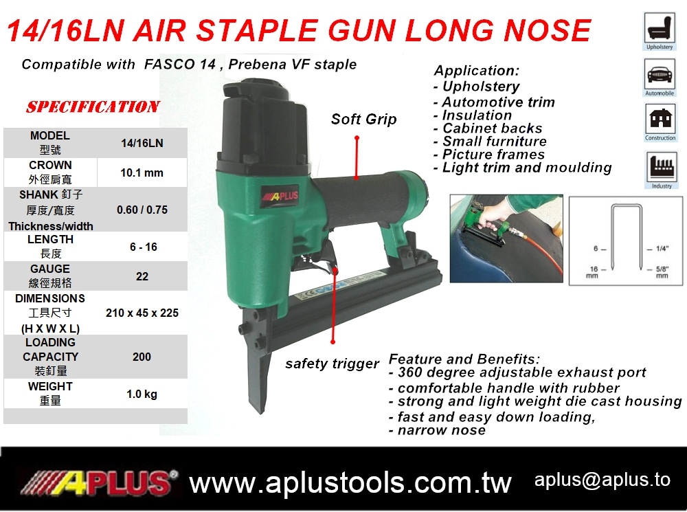 APLUS 14/16LN,6-16mm,12.6mm 冠部,50mm 长鼻,双扳机,气钉枪