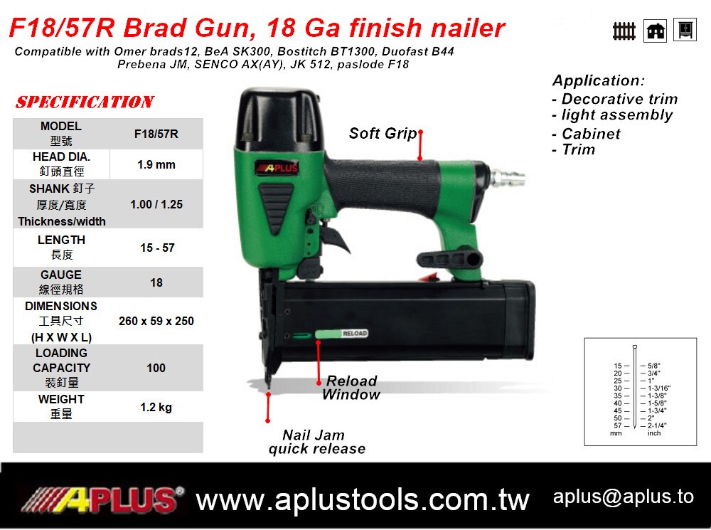 APLUS F18/57R, 18GA 57MM REAR EXHAUST FINISH AIR NAIL GUN REDUCE VIBRATION , REDUCE NOISE