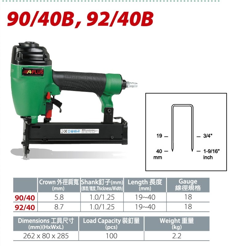 APLUS 92/40B、18GA 19-40MM、8.7MM 皇冠、底部装载、气钉枪