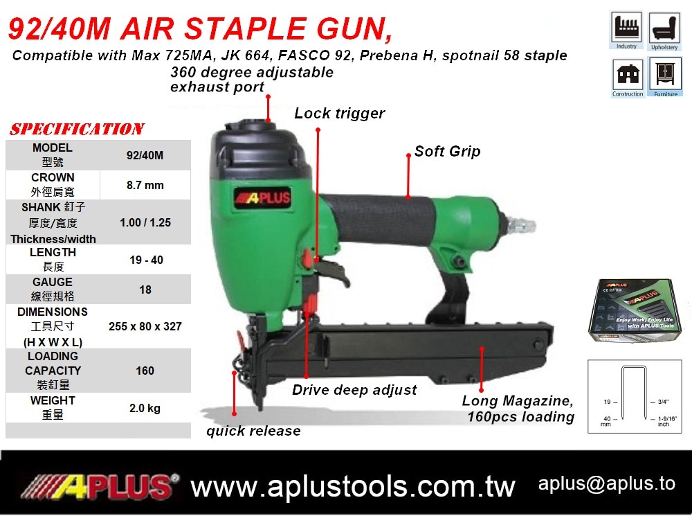 • APLUS 92/40M,18GA 5.8MM 皇冠,1.0x1.25mm SENCO L,92 钉书钉工具长弹匣气钉枪