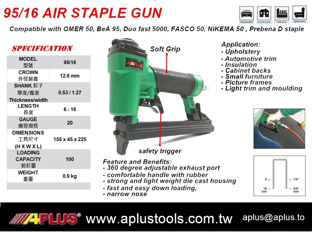 APLUS 95/16,16 毫米,12.6 毫米冠,95 型,软装气钉枪,双扳机