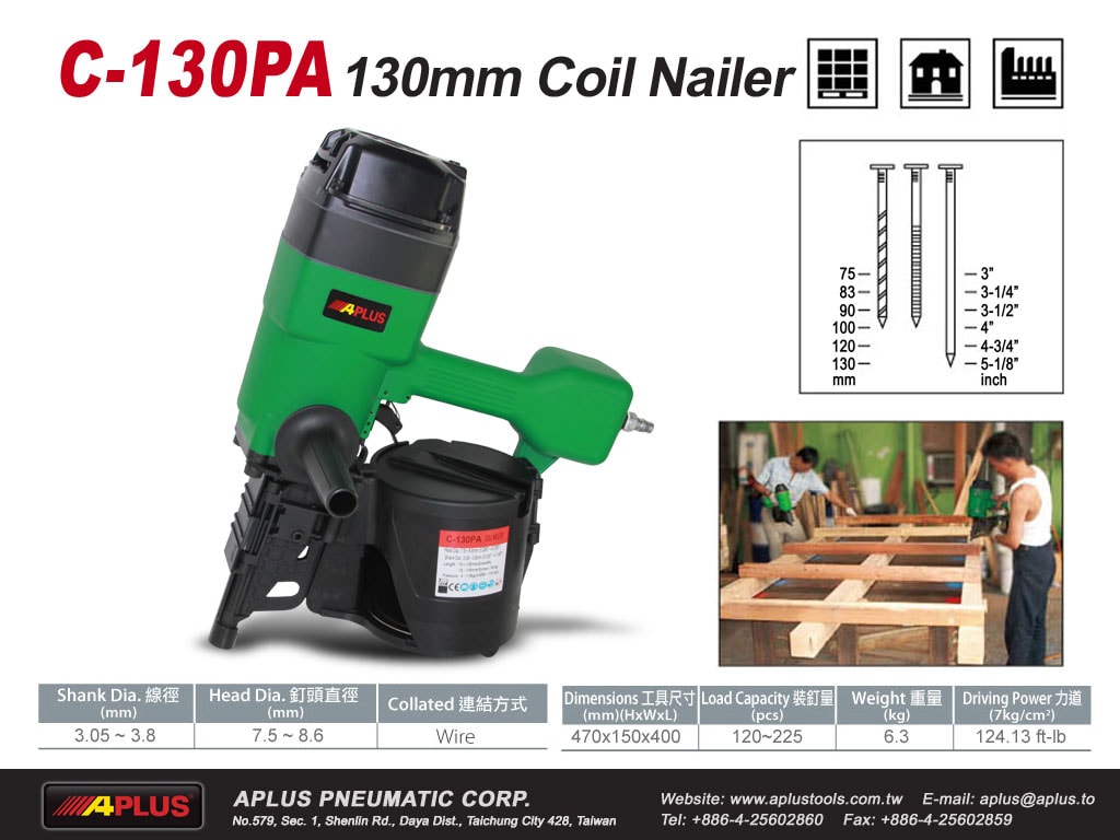 APLUS C-130PA,CN130,130 毫米卷钉枪,钉杆从 3.05 到 3.8 毫米,长度从 75 毫米到 130 毫米,适用于重型托盘、框架和装箱