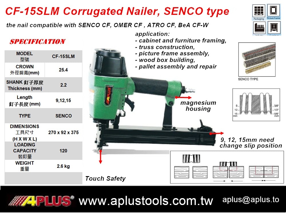 APLUS CF-15SLM 波纹钉枪,SENCO 型镁外壳,触摸安全,3 行程长弹匣