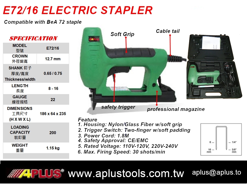 APLUS E72/16,12.7mm皇冠,8-16mm 0.65x0.75mm,72型家具电动钉枪