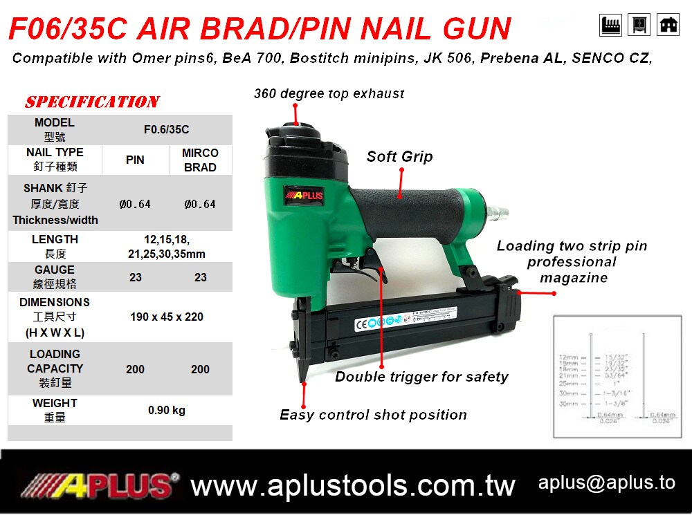 • APLUS F0.6/35C 钉枪、23Ga 空气钉枪、12-35mm 钉枪和 Bradair Pinner 无头钉枪 蚊钉枪