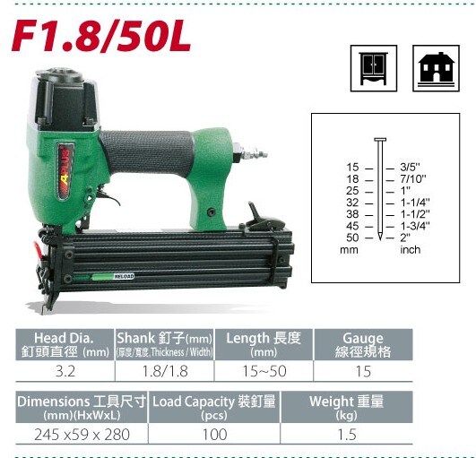 APLUS F1.8/50L 混凝土钉枪,FST 混凝土钉,15Ga,1.8 毫米钉杆,3.2 毫米头部,50 毫米长度
