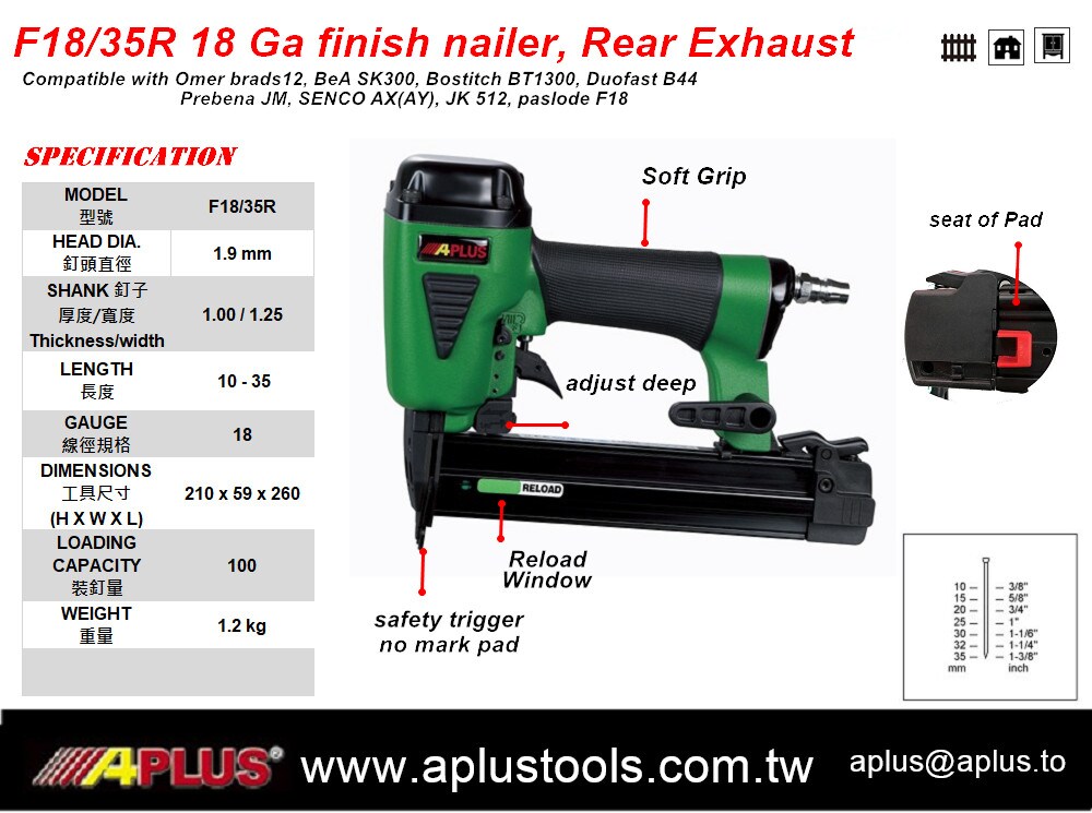 APLUS F18/35R,18GA 35MM后排气气钉枪 减振降噪