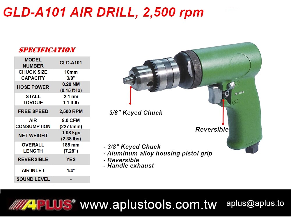 APLUS GLD-A101,风钻,3/8" 钥匙夹头,手枪式握把,可逆,手柄排气,齿轮类型,2,500RPM