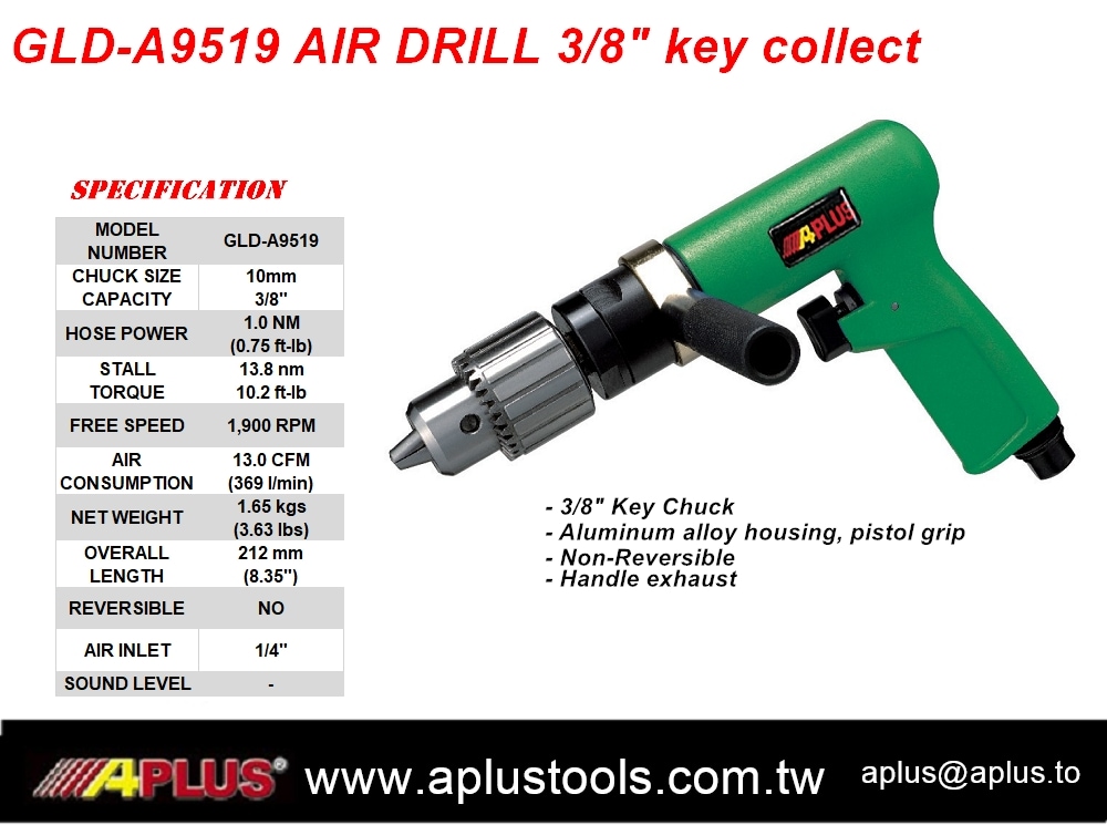 APLUS GLD-A9519,齿轮式风钻,手枪式握把,3/8" 夹头,铝制外壳,不可反转,手柄排气