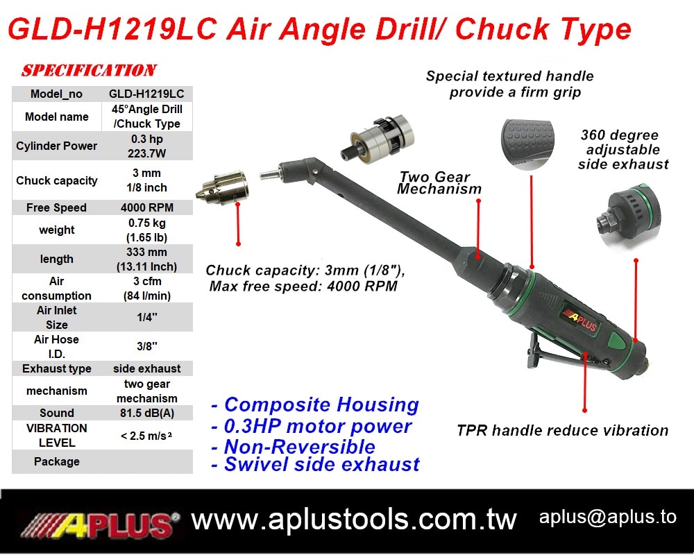APLUS GLD-H1219LC 空气角钻,卡盘式延长长度,0.3HP,4000rpm,复合材料外壳,直握把
