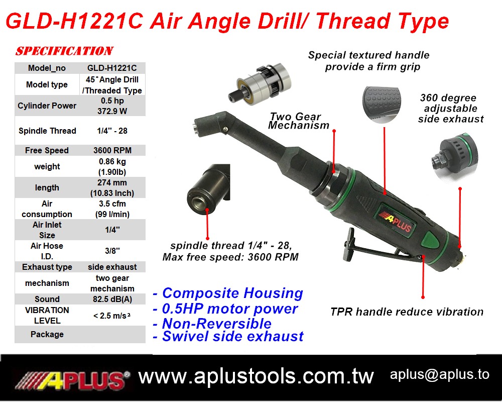 APLUS GLD-H1221C 风动角钻,螺纹型 45 度刀头,0.5HP,3600rpm,复合材料外壳,直握式气动工具