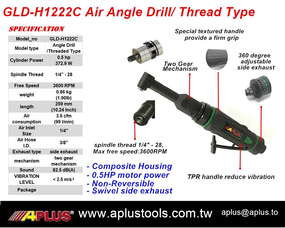 APLUS GLD-H1222C 风动角钻,螺纹型 0.5HP,3600rpm,复合材料外壳,直握式气动工具
