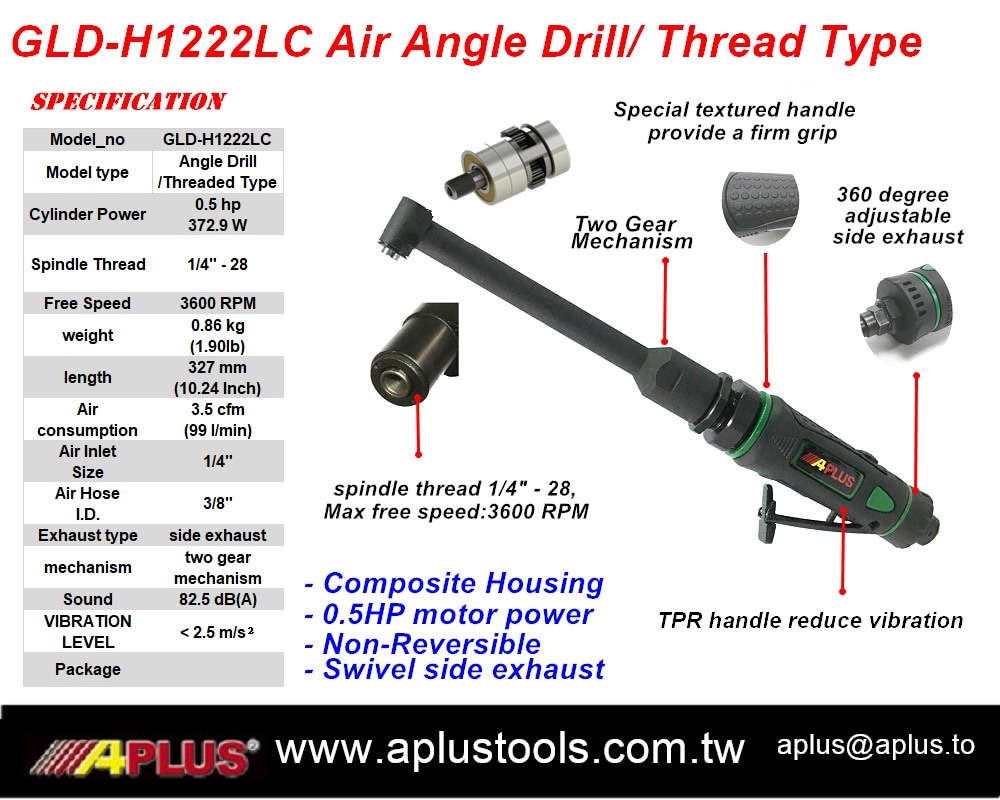 APLUS GLD-H1222LC 风动角钻,集装型 0.5HP,3600rpm,复合材料外壳,直握式气动工具
