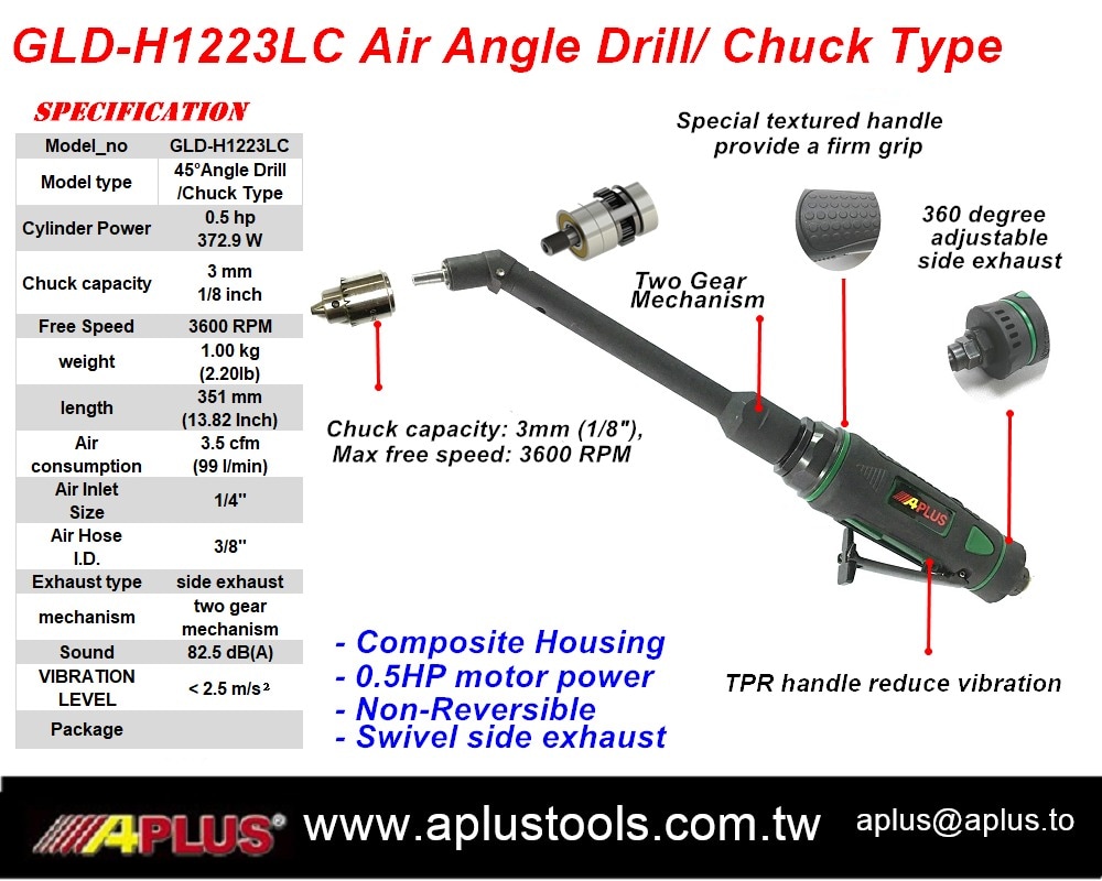 APLUS GLD-H1223LC 风动角钻,集装型 0.5HP,3600rpm,复合材料外壳,直握式气动工具