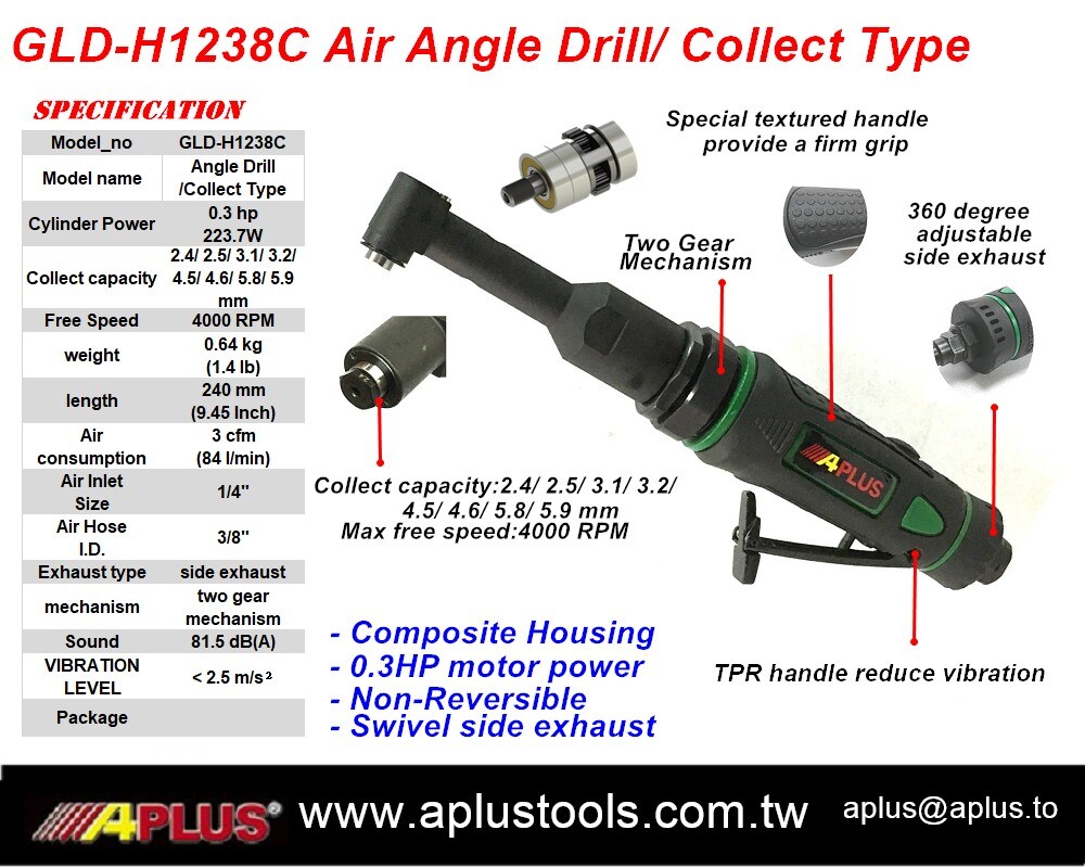 APLUS GLD-H1238C 风动角钻,集装型 0.3HP,4000rpm,复合材料外壳,直握式气动工具