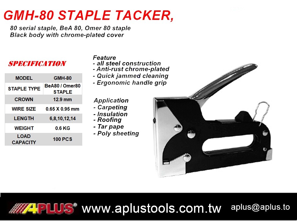 Staple capacity: 100 pcs (1 strip) Finish: Black body & chrome cover Packaging: color box; 10 pcs per carton