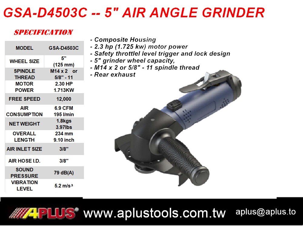 APLUS GSA-D4503C,5" 空气角磨机,复合外壳,2.3HP,12,000 rpm,100mm 砂轮。