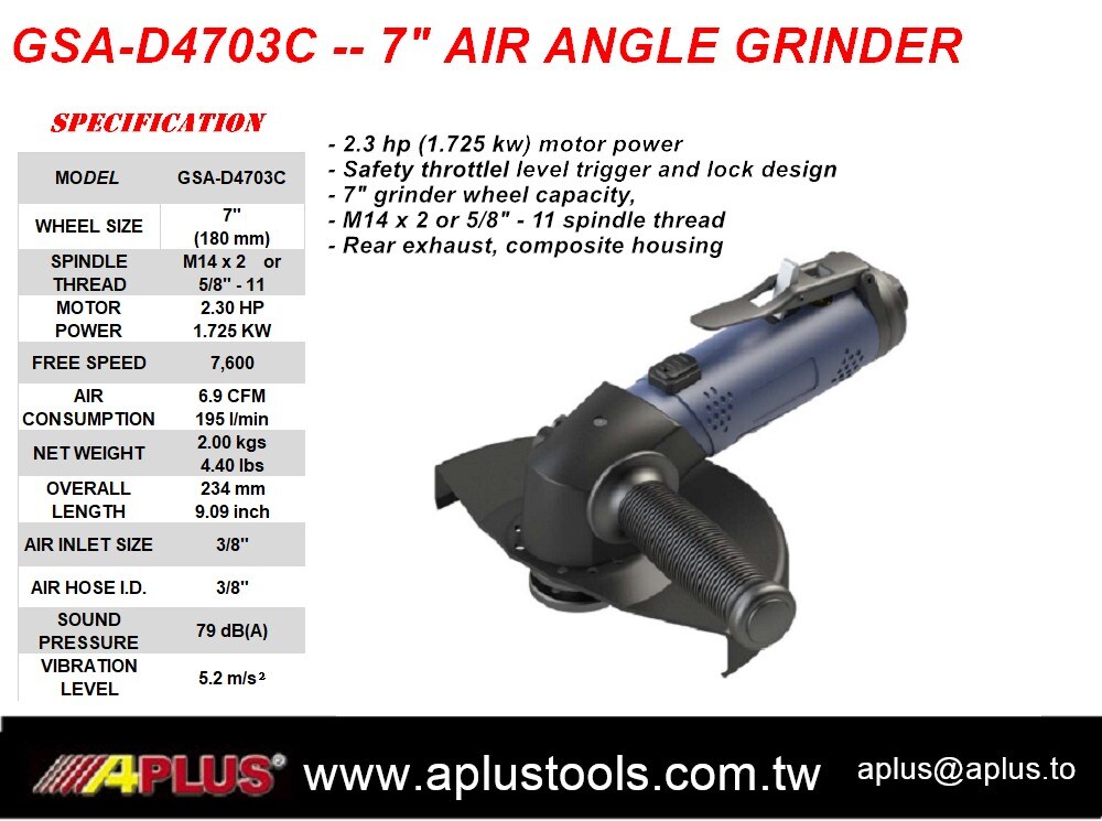 APLUS GSA-D4703C,7" 空气角磨机,复合外壳 2.3HP,7600 rpm,180mm 砂轮。后排气