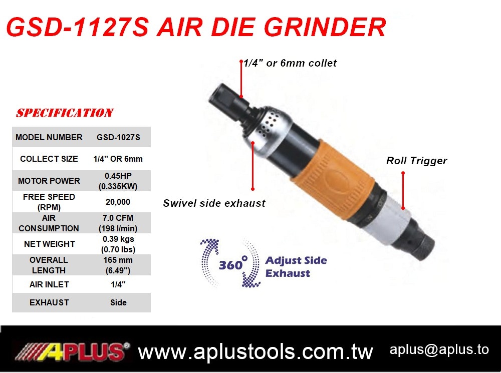 APLUS GSD-1027S,1/4" 或 6MM 空气直式 0.45hp 20,000 rpm 模磨机,旋转开关,侧排气