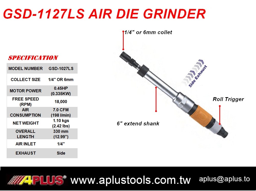 APLUS GSD-1027SL,1/4" 或 6MM AIR STRAIGHT -0.45 HP 18,000 rpm 工业模具磨床。侧面排气。旋转扳机