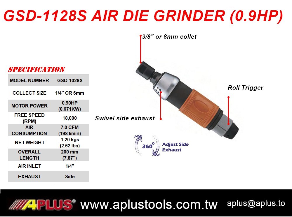 APLUS GSD-1028S,1/4" 或 6MM AIR STRAIGHT -0.9 HP 18,000 rpm 工业模具磨床。侧面排气。旋转扳机