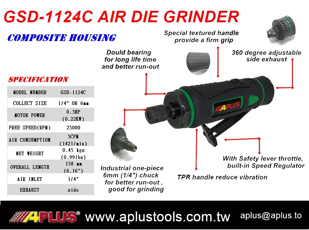 • APLUS GSD-1124C,复合外壳,直磨机,风动模具磨床。 6 毫米夹头尺寸。 后排气。