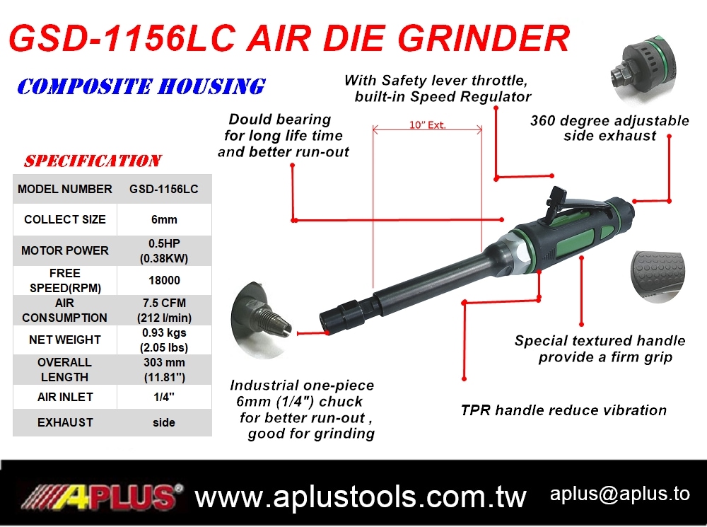 • APLUS GSD-1156LC,1/4" 或 6MM 10" 加长直风模磨机 0.5HP 18,000 rpm 复合外壳 气动刻模机 - 复合材料枪体 侧排气