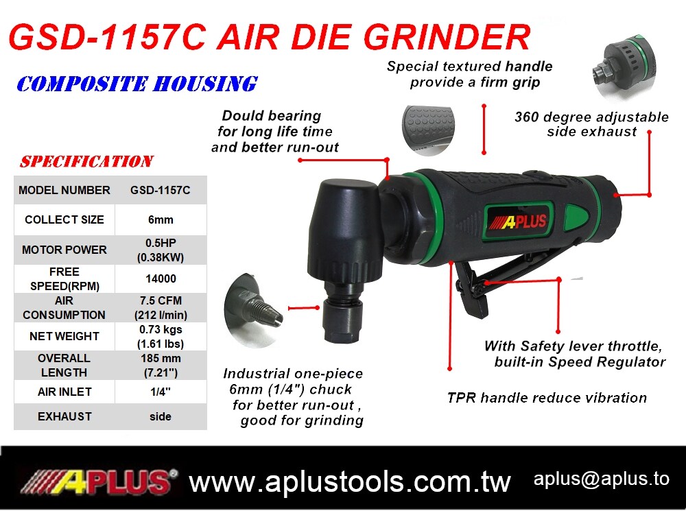 APLUS GSD-1157C,复合材料外壳,0.5HP 空气模磨机。 14,000 rpm 6 毫米夹头尺寸。 旋转侧排气。