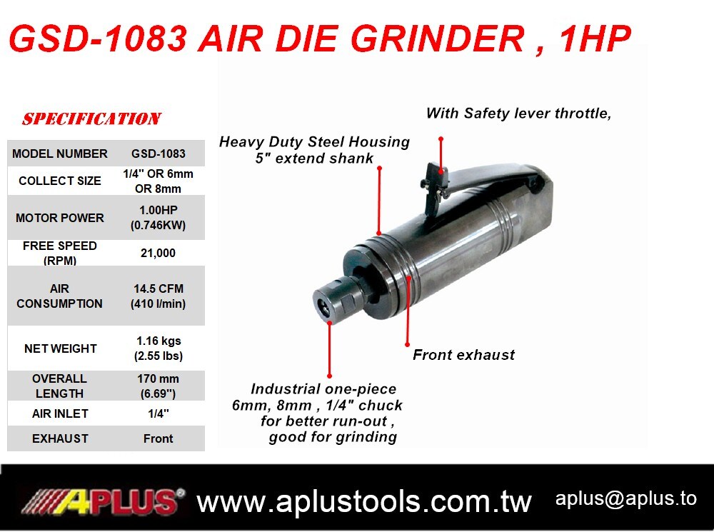 APLUS GSD-1183 气动模具研磨机 1.0 HP 全功率工业气动模具研磨机,带水平触发器。 钢制外壳
