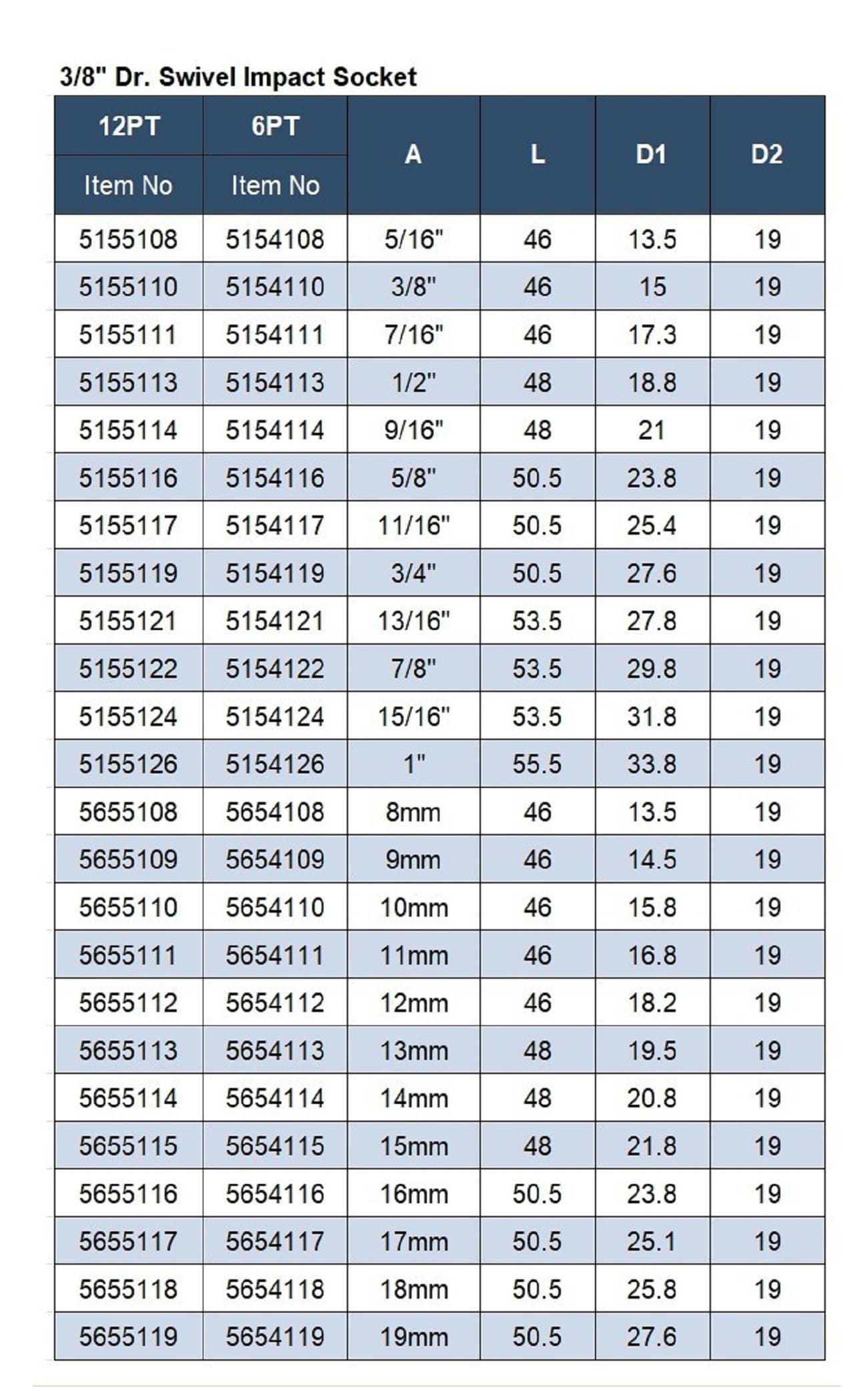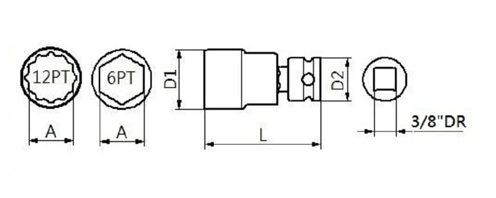 • APLUS GTS-5155116 3/8" Dr. 旋转冲击套筒 12PT A: 5/8" L: 50.5mm 长 D1: 23.8mm, D2: 19mm