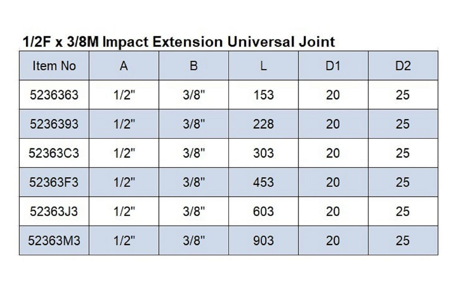 - 旋转头延长件上的 1/2"F x 3/8"M 冲击适配器具有不同的长度