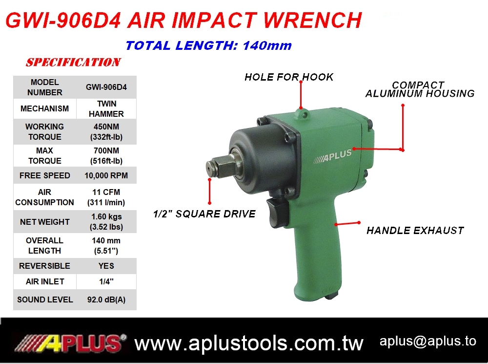 APLUS GWI-906D4 1/2" AIR IMPACK WRENCK 长度 140mm 双环型手柄排气