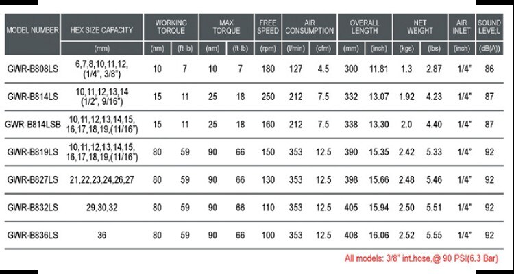 | Model | Bolt Size Capacity | working torque | Max Torque | Free Speed | Air Comsumption | Overall Length | Air Inlet | Net Weight | Sound Lever | ||||||