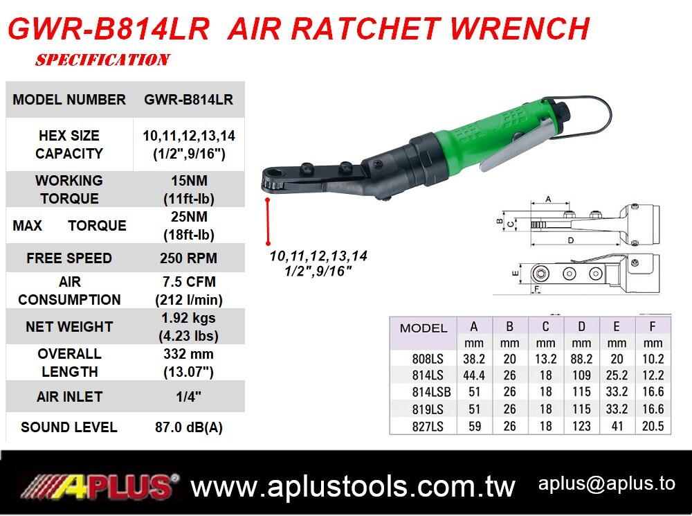 APLUS GWR-B814LR 气动棘轮扳手,10,11,12,13,14mm 1/2", 9/16" 六角尺寸,后排气,可逆,最大扭矩 25nm