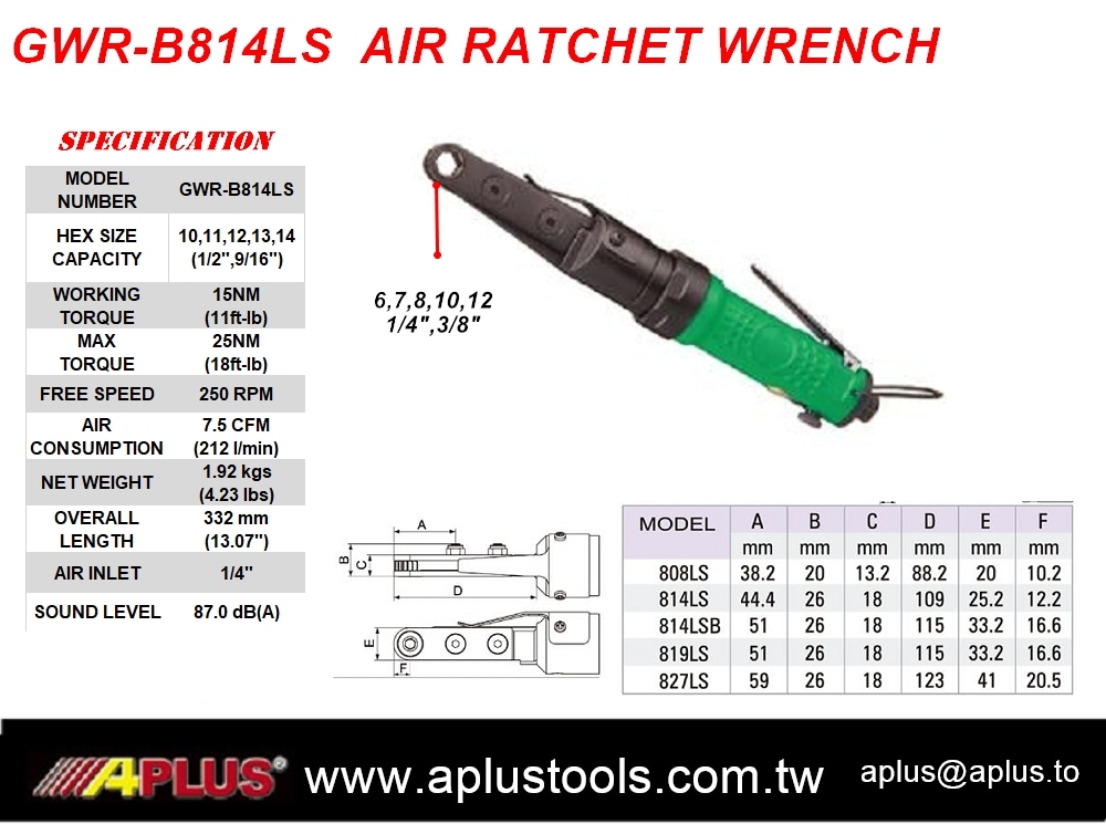 • APLUS GWR-B814LS 气动棘轮扳手,10,11,12,13,14mm 1/2", 9/16" 六角尺寸,后排气,可逆,最大扭矩 25nm