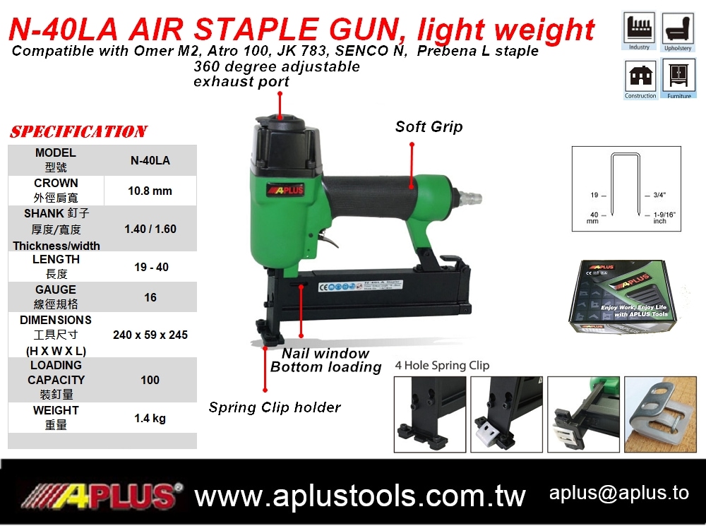 APLUS N-40LA,16GA 20-40mm length, 10.8mm CROWN, shank 1.4x1.6mm,SENCO N 釘槍 適用於沙發彈簧固定片