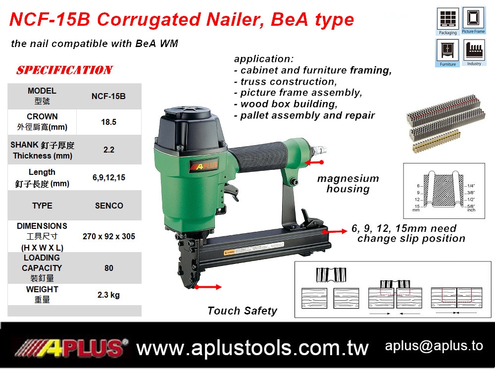 APLUS NCF-15B 波纹钉枪,冠部:18.5mm,BeA 型长度:6、9、12、15mm 镁外壳,触摸安全,
