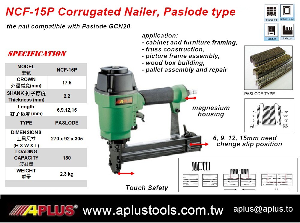 • APLUS NCF-15P 波纹钉枪,冠部:17.5mm,Paslode 型长度:6、9、12、15mm 镁外壳,触摸安全,