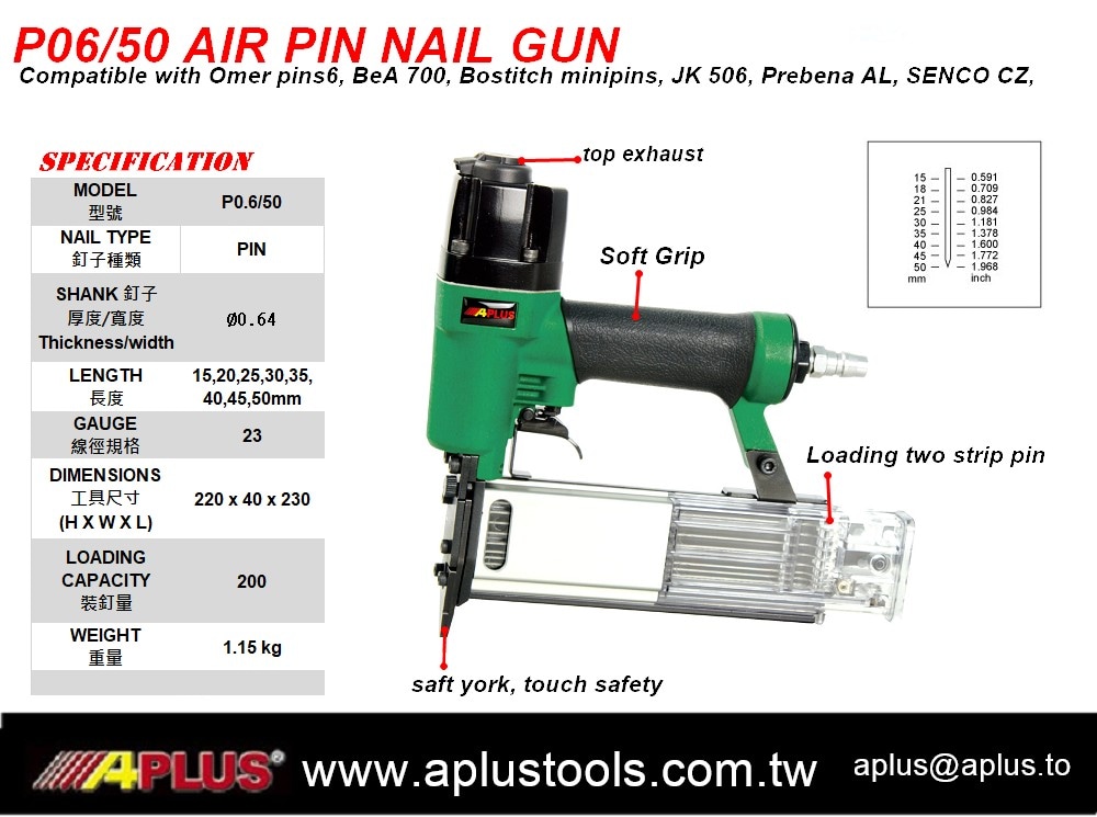 APLUS P0.6/50 氣動蚊釘槍、23Ga 20-50mm 無頭釘子 線徑 0.64x0.64, 側裝釘 槍嘴無痕墊 適用於 雕刻和裝飾品