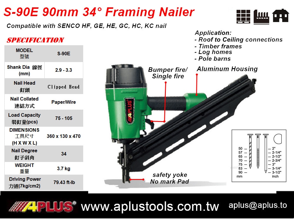 APLUS S-90E 射钉枪,直插式外壳,34 度,纸排钉,夹头,驱动器从 50mm 到 90mm,