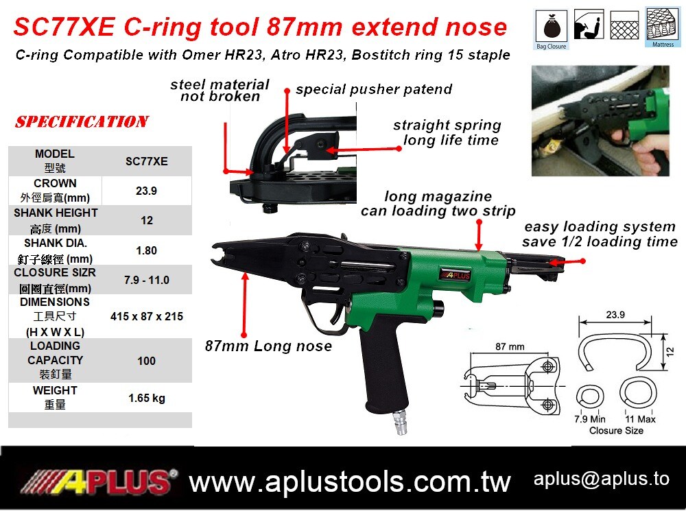 APLUS SC77XE C 型环工具,Hog Ring 冠部:23.9 毫米 柄部:1.8 毫米 闭合尺寸:7.9-11 毫米,87 毫米延长鼻 床垫、床上用品、汽车座椅