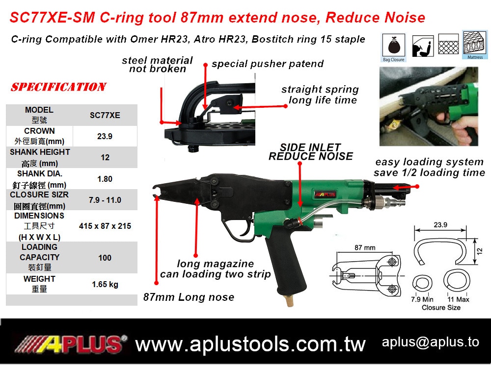 APLUS SC77XE-SM 气动C型枪 肩宽:23.9mm,长嘴 87mm 和 降低噪音设计 使用在 床垫、汽车座椅