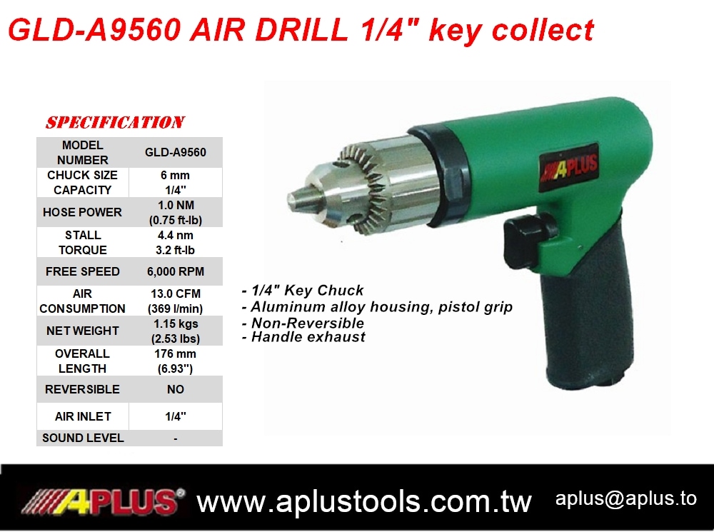 • GLD-A95185 齿轮式风钻 手枪式握把,铝制外壳,不可反转,手柄排气 齿轮式风钻